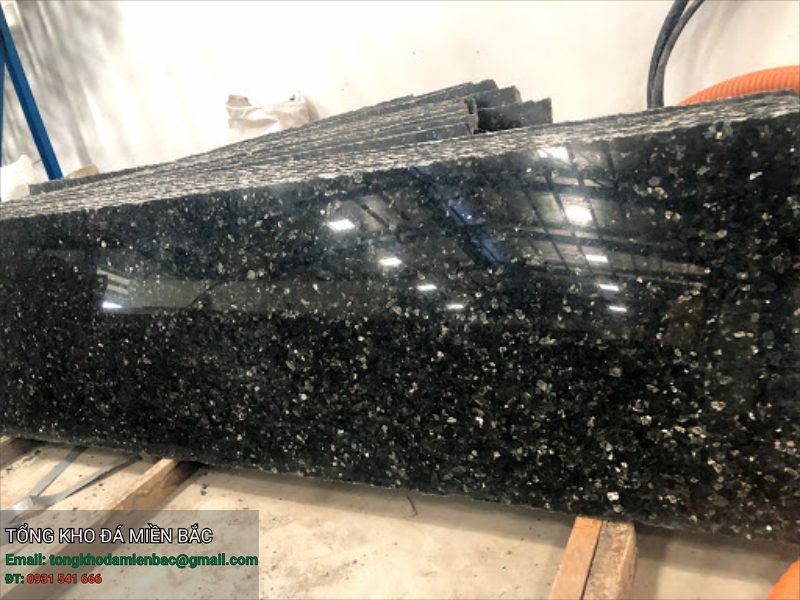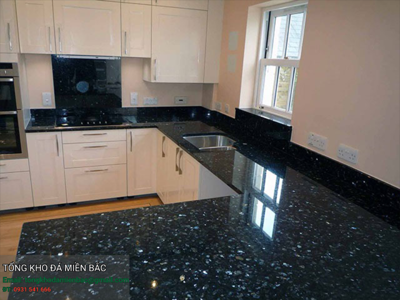 Đá xà cừ xanh là dòng đá Granite tự nhiên nhập khẩu, nổi bật với nền đá màu đen sẫm kết hợp các hạt khoáng xà cừ ánh xanh, bạc lấp lánh. Khi có ánh sáng chiếu vào, bề mặt đá tạo hiệu ứng phản chiếu sang trọng, mang lại cảm giác cao cấp và khác biệt cho khu vực bếp.